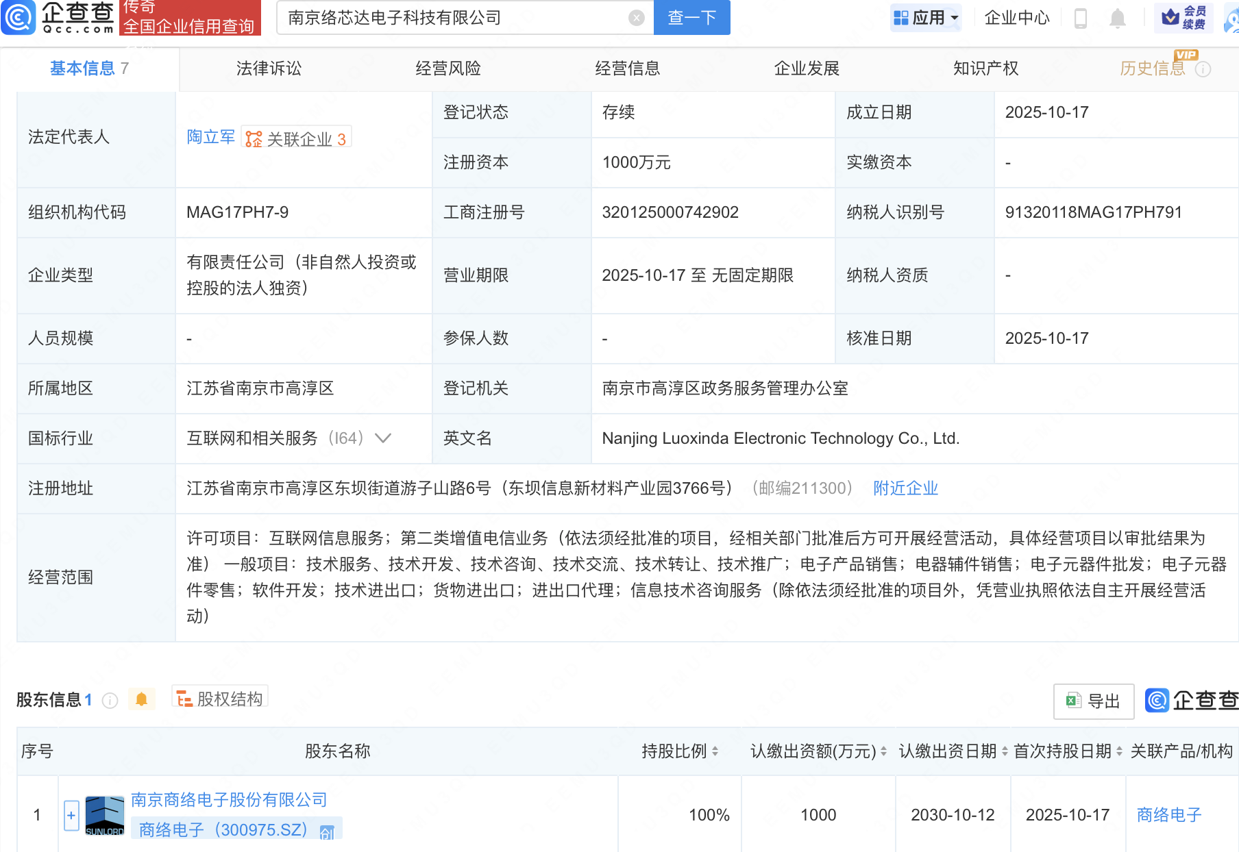 近日,南京络芯达电子科技有限公司成立,注册资本1000万元,经营范围包含:互联网信息服务;第二类增值电信业务;电子元器件批发等。企查查股权穿透显示,该公司由商络电子(300975)全资持股。